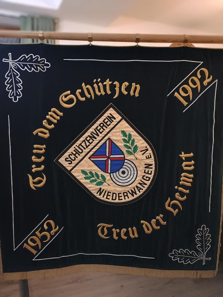 Unterhalb des Motivs befindet sich der Schriftzug „Niederwangen“ in gotischem Stil, ebenfalls in erhabener Goldstickerei. Auch hier schmücken Eichenlaubverzierungen die vier Ecken. Zusätzlich ist die Fahne mit goldenen Fransen versehen und an der Stangenseite mit einer Kordel und Messingringen ausgestattet.